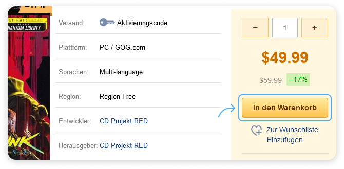 Suchen Sie das Spiel, an dem Sie interessiert sind, öffnen Sie die Seite und klicken Sie auf die Schaltfläche "In den Warenkorb". Als Beispiel haben wir „Doom Eternal“ genommen.
