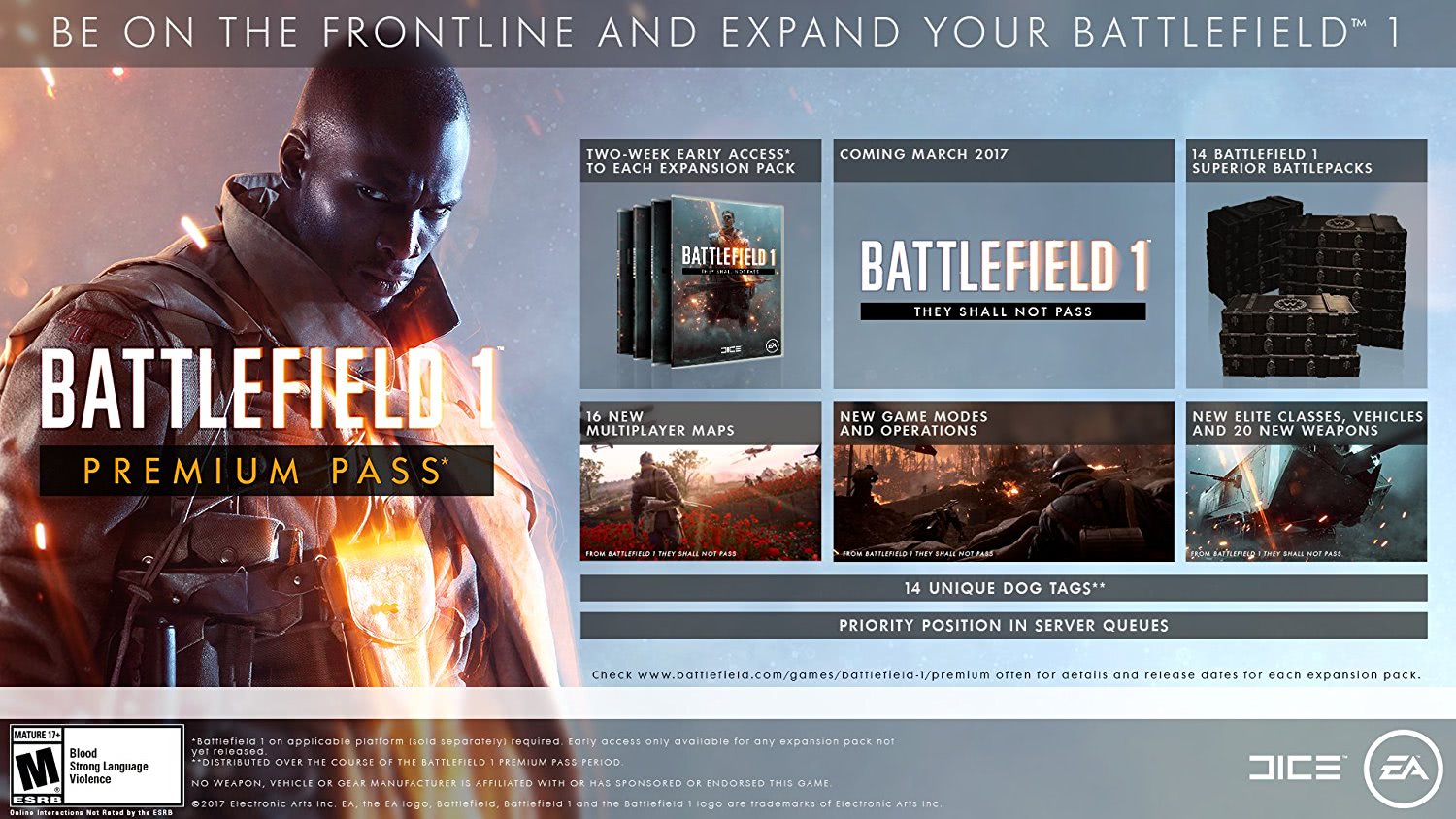 - Все Premium-добавления. Вас ждут новые операции и игровые режимы, новые элитные классы, новое оружие и многое другое. С Premium Pass для Battlefield 1 вы получите 16 новых карт для сетевой игры, 20 новых видов оружия, 14 уникальных жетонов и 14 выдающихся боевых наборов для Battlefield 1 с очень редкими обликами для оружия. Каждый боевой набор доставляется раз в месяц.